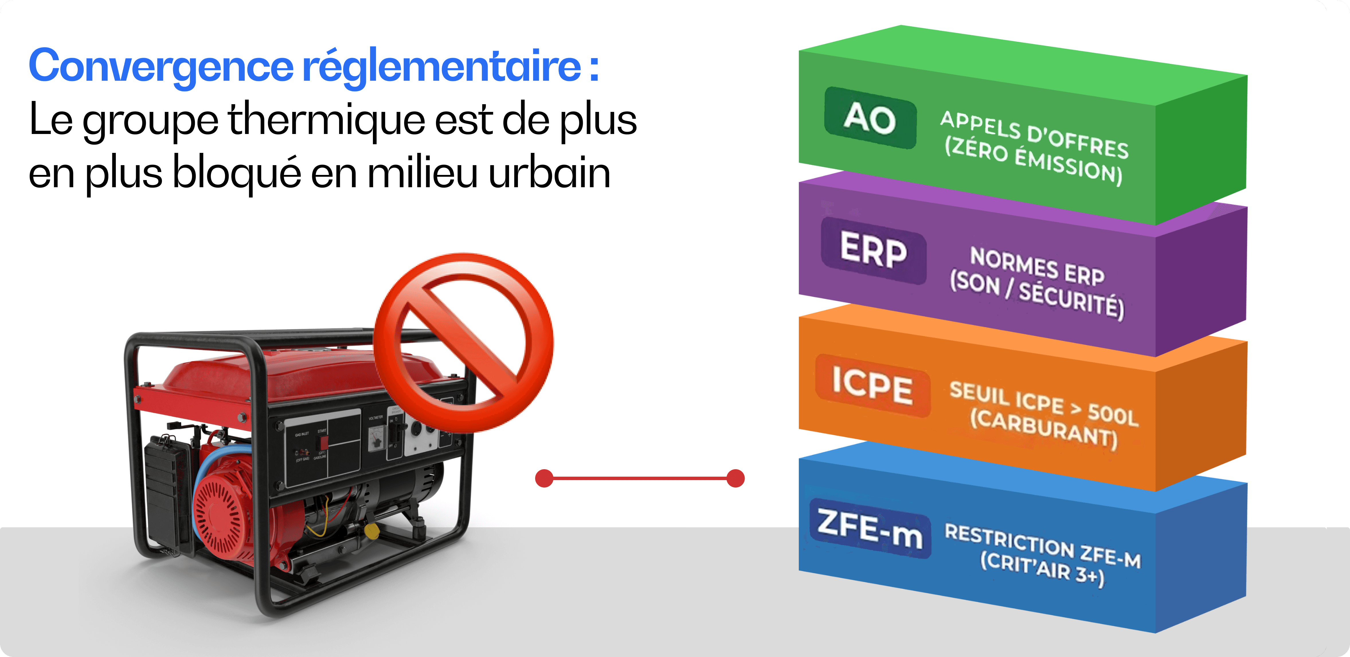 Ces pratiques, déjà en vigueur, montrent que les groupes électrogènes thermiques ne sont plus considérés comme acceptables, ni sur le plan réglementaire, ni sur le plan opérationnel.