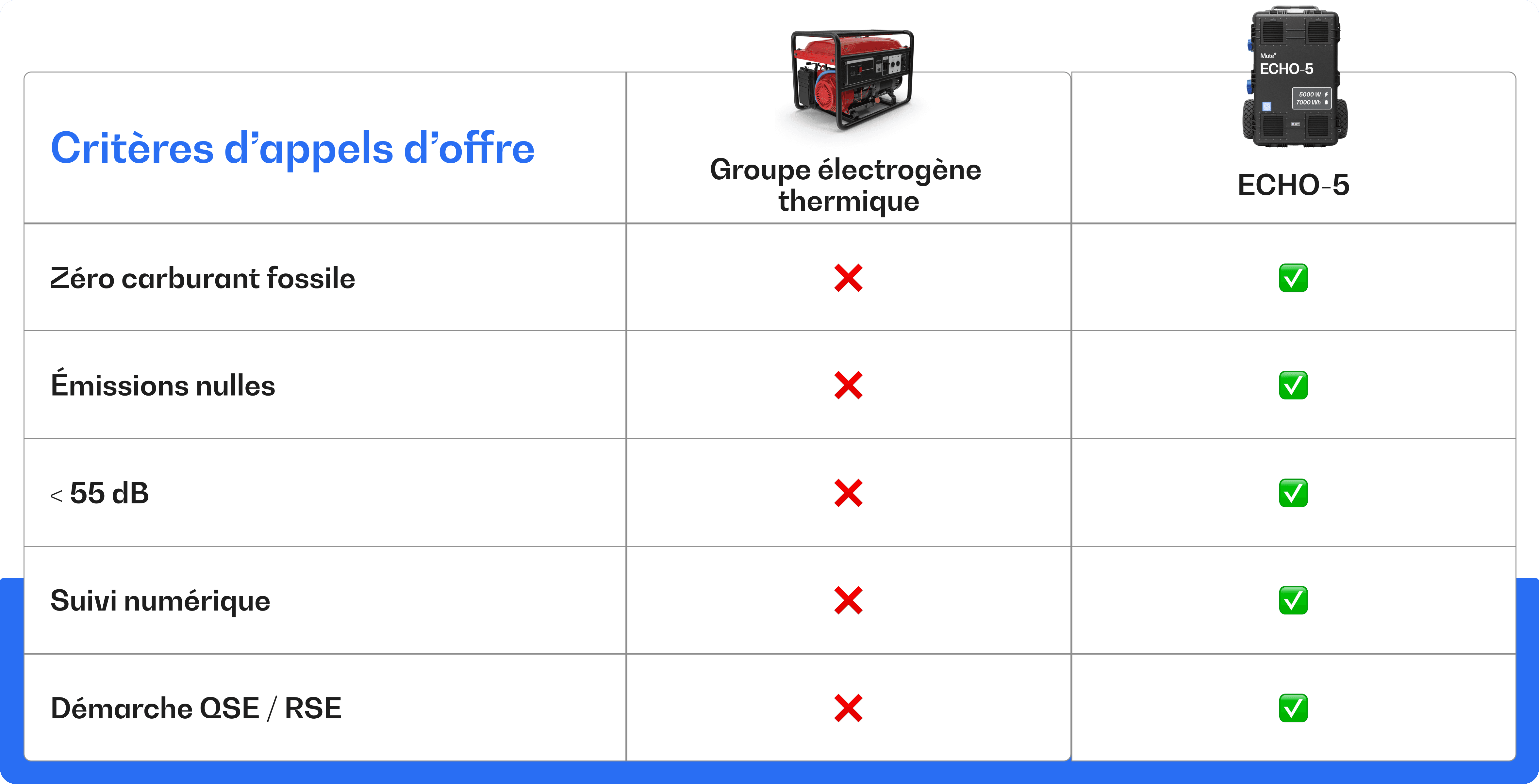 Un groupe électrogène thermique ne peut répondre à aucun de ces critères. Sa présence dans un dossier technique est donc désormais un désavantage concurrentiel clair.